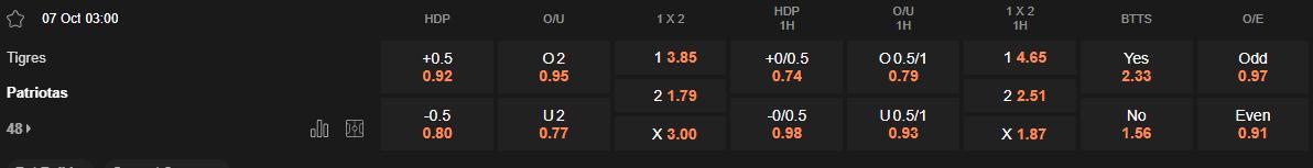 Phong độ nhập cuộc của Patriotas trong giai đoạn gần đây rất đáng tin cậy. Họ ghi bàn trong hiệp 1 ở 2/3 trận thắng gần nhất, đồng thời luôn giữ thế chủ động ngay từ những phút đầu tiên. Sự linh hoạt trong cách vận hành tấn công, đang là điểm mạnh giúp Patriotas dễ dàng vươn lên dẫn trước sớm. Trong khi đó, Tigres lại là đội thường khởi đầu chậm chạp và dễ bị thủng lưới sớm. Thống kê cho thấy, trong 3 trận thua gần nhất, họ có đến 2 lần để đối thủ mở tỷ số trong hiệp 1. Hàng thủ thiếu tập trung cùng khả năng chống bóng bổng yếu khiến Tigres nhiều lần bị khai thác ở những tình huống cố định hoặc phản công nhanh. Do đó, Patriotas hoàn toàn có thể định đoạt cục diện ngay trong 45 phút đầu tiên.