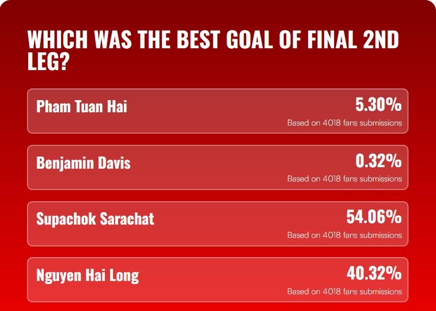 Tính đến 6h30 ngày 7/1, bàn thắng nâng tỷ số lên 2-1 của Supachok nhận được 54,06% số phiếu bầu, vượt xa pha lập công đẹp mắt của Nguyễn Hai Long với 40,32%. Hai bàn còn lại trong danh sách bình chọn thuộc về Phạm Tuấn Hải (5,30%) và Benjamin Davis (0,32%), nhưng không thể cạnh tranh với hai ứng viên hàng đầu.