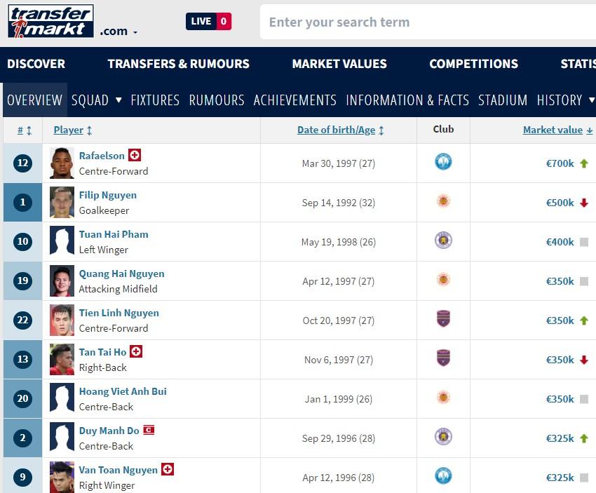 Phạm Tuấn Hải, tiền đạo của CLB Hà Nội, đứng thứ ba với mức định giá 400.000 Euro. Các cầu thủ nổi bật khác như Nguyễn Quang Hải, Nguyễn Tiến Linh, Hồ Tấn Tài, và Bùi Hoàng Việt Anh đều được định giá ở mức 350.000 Euro.