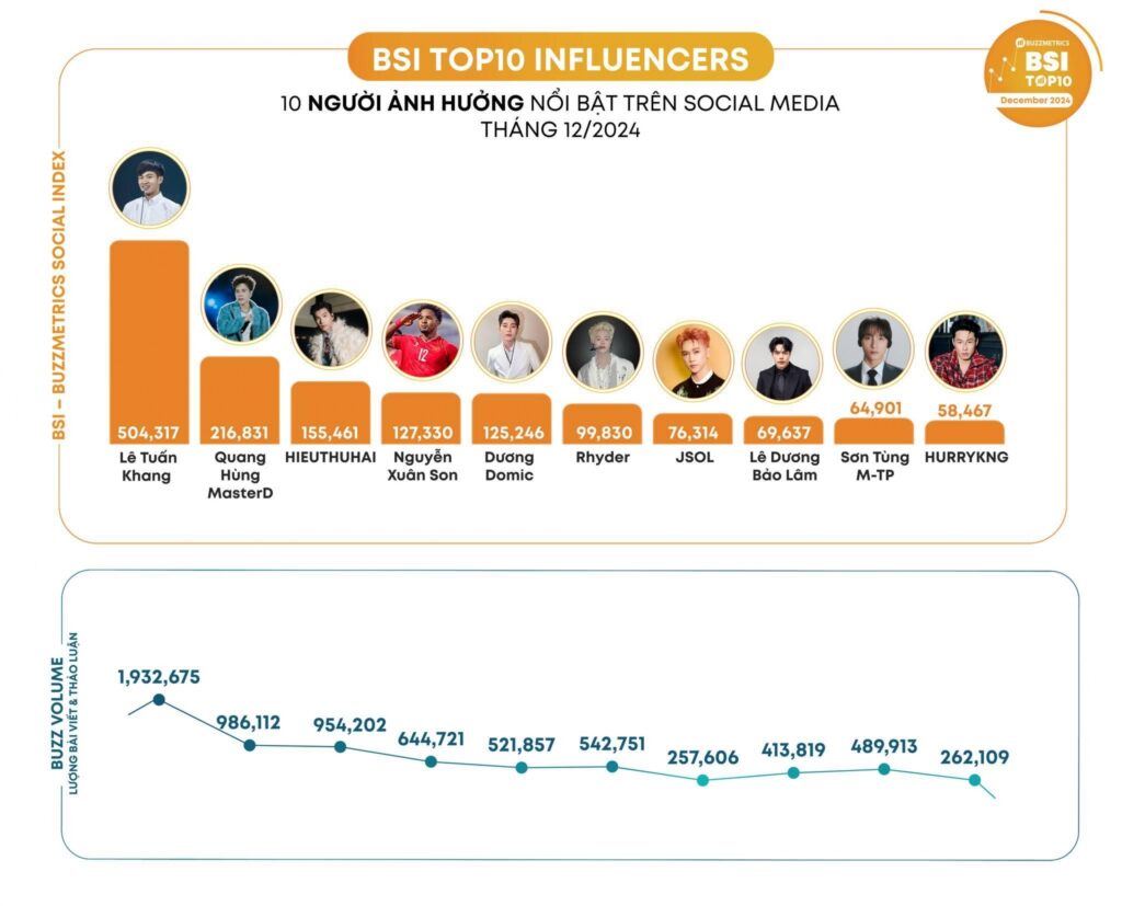 Trong bảng xếp hạng Buzzmetrics Social Index Top 10, Nguyễn Xuân Son đứng ở vị trí thứ 4 với chỉ số 127.330, vượt qua nhiều nghệ sĩ nổi tiếng như Sơn Tùng M-TP, Rhyder hay Dương Domic. Đây là lần đầu tiên tiền đạo sinh năm 1997 góp mặt trong danh sách này, một thành tích đáng tự hào cho cầu thủ vừa ra mắt đội tuyển quốc gia và góp phần quan trọng vào chức vô địch AFF Cup 2024 của Việt Nam.