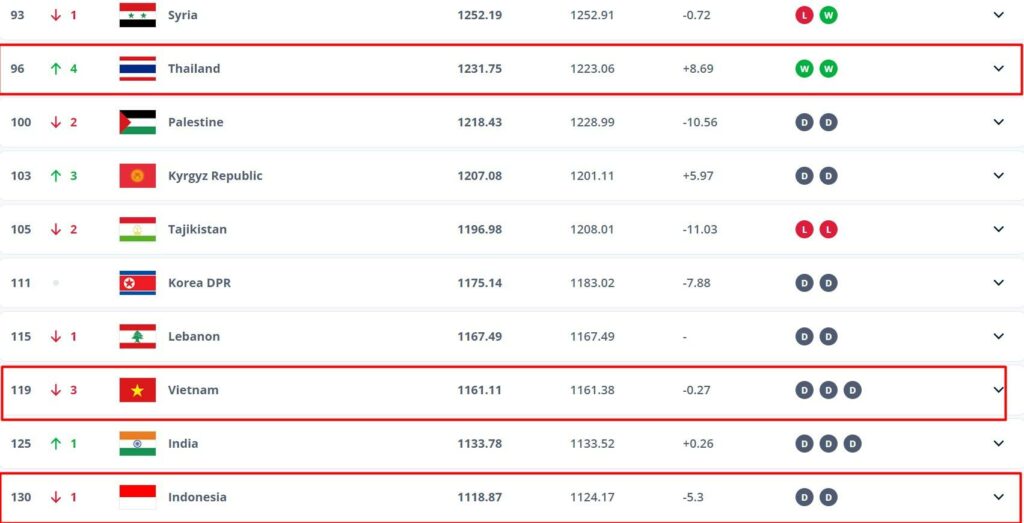 Sự thăng hoa của Thái Lan tạo ra một sự tương phản rõ nét với Việt Nam. Sau trận hòa trước Ấn Độ, đội tuyển Việt Nam đã tụt 3 bậc xuống vị trí thứ 119. Điều này cho thấy sự chững lại của bóng đá Việt Nam trong thời gian gần đây.
