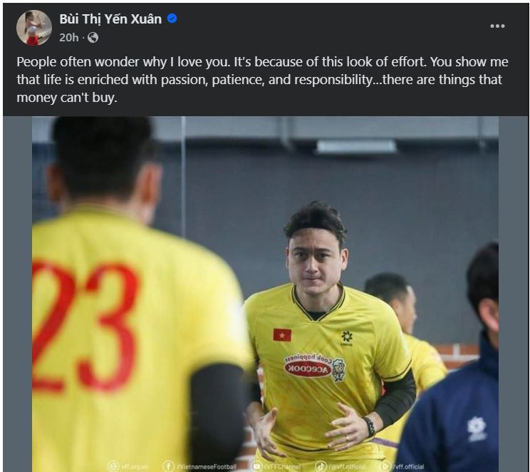 Trong không khí sôi động của đợt tập huấn tại Hàn Quốc, thủ thành Đặng Văn Lâm đã nhận được một món quà tinh thần vô giá từ bà xã Yến Xuân. Trên trang cá nhân, cô nàng đã chia sẻ một bức ảnh Văn Lâm đang tập luyện miệt mài trong phòng gym cùng lời nhắn nhủ đầy cảm xúc: “Nhiều người thắc mắc rằng tại sao em lại yêu anh. Câu trả lời là ánh mắt đầy quyết tâm này. Anh cho em thấy cuộc sống này thật đẹp khi có đam mê, sự kiên trì và trách nhiệm. Đó là những thứ mà tiền không bao giờ mua được”.