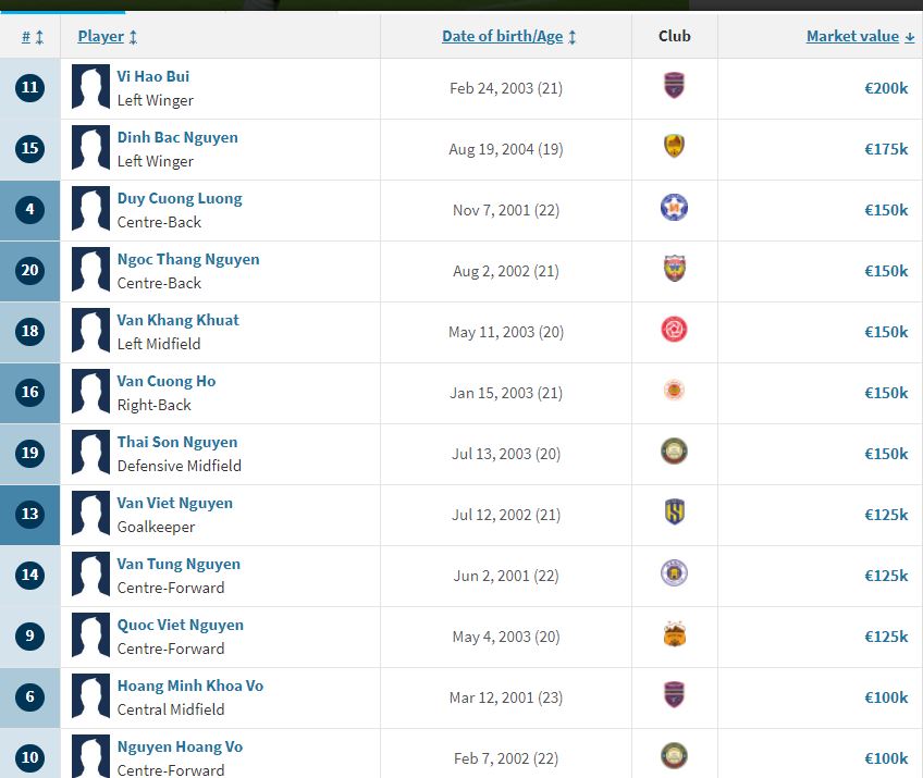 Ngoài Bùi Vĩ Hào và Đình Bắc, U23 Việt Nam còn sở hữu nhiều cầu thủ trẻ tiềm năng khác được định giá cao như Lương Duy Cương, Khuất Văn Khang, Nguyễn Thái Sơn, Nguyễn Ngọc Thắng và Hồ Văn Cương (cùng 150.000 Euro).