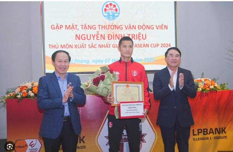 Ngày 7/1/2025, Nguyễn Đình Triệu, thủ môn xuất sắc của đội tuyển Việt Nam, đã được vinh danh bởi lãnh đạo thành phố Hải Phòng sau hành trình đầy cảm xúc tại AFF Cup 2024. Với màn trình diễn ấn tượng giúp đội tuyển giành Huy chương Vàng, Đình Triệu được Chủ tịch Ủy ban nhân dân thành phố Hải Phòng trao tặng Bằng khen cùng phần thưởng trị giá 550 triệu đồng.