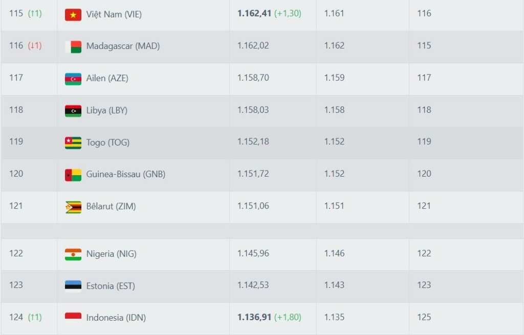 Tương tự, đội tuyển Indonesia, sau chiến thắng nhọc nhằn 1-0 trước Myanmar, cũng được cộng 1,8 điểm, giúp họ leo lên vị trí 124 thế giới. Những thay đổi này cho thấy tầm quan trọng của AFF Cup không chỉ ở khía cạnh danh hiệu mà còn ở khả năng tích lũy điểm số FIFA.