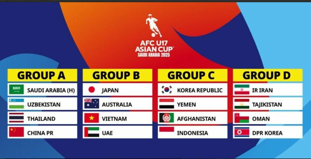 VCK U17 châu Á 2025, diễn ra từ ngày 3/4 đến 20/4 tại Ả Rập Xê Út, quy tụ 16 đội mạnh nhất khu vực, được chia thành 4 bảng. Hai đội đứng đầu mỗi bảng không chỉ giành vé vào tứ kết mà còn đoạt quyền tham dự VCK U17 World Cup 2025 tại Qatar.
