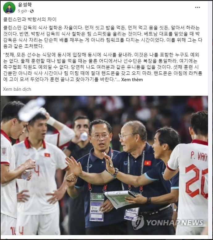 Trong bài viết, chuyên gia người Hàn Quốc đã trình bày quan điểm của mình: “HLV Klinsmann mỗi khi tổ chức cho các cầu thủ ăn uống, ông ấy ưa thích sự tự chủ trong việc tổ chức bữa ăn. Dù là rửa tay trước hay sau khi ăn, cầu thủ được tự quyết định.