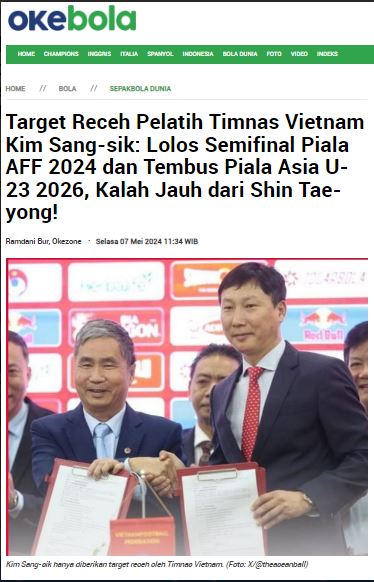 Theo truyền thông Indonesia, trọng trách ông Kim Sang Sik phải nhận cũng thua hẳn HLV Shin Tae Yong. Tờ Okezone giật dòng tít: “Mục tiêu của HLV đội tuyển Việt Nam Kim Sang Sik: Vượt qua Bán kết AFF Cup 2024 và lọt vào VCK U23 châu Á 2026, thua xa Shin Tae Yong!”.