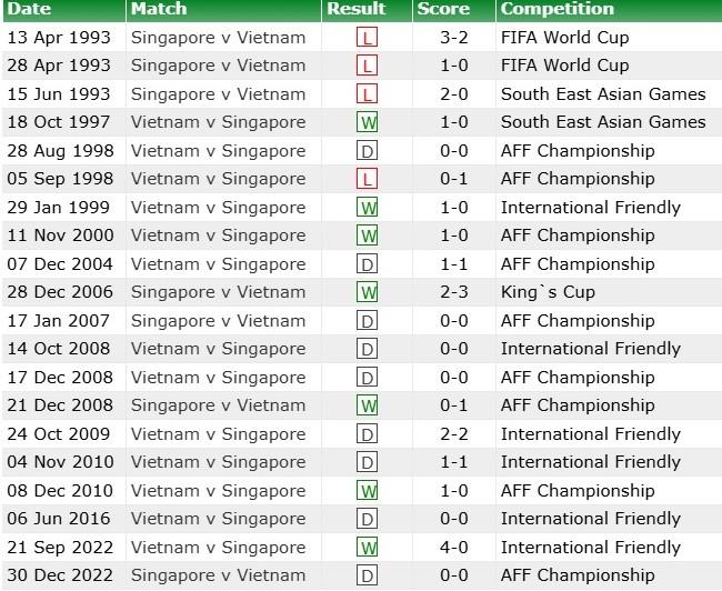 Điều đáng chú ý là Đội tuyển Việt Nam đã bất bại trước Singapore trong suốt 25 năm qua. Kể từ thất bại đau đớn ở trận chung kết Tiger Cup 1998, khi bàn thắng oái oăm của Sasi Kumar giúp Singapore giành chiến thắng, Đội tuyển Việt Nam đã hoàn toàn làm chủ được đối thủ này.