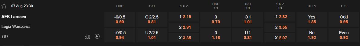 Legia Warsaw dù có dàn cầu thủ chất lượng nhưng lại vừa để đối thủ yếu hơn là Arka Gdynia cầm hòa 0-0, qua đó thua kèo châu Á. Điều này dấy lên những nghi ngờ về khả năng duy trì sự tập trung cũng như phong độ thi đấu của đội bóng Ba Lan. Đặc biệt khi họ phải thi đấu trên sân khách – nơi mà Legia thường gặp khó khăn. Với lợi thế sân nhà, phong độ tốt, và đối thủ không ở trạng thái ổn định nhất, AEK Larnaca là lựa chọn đáng tin cậy ở kèo châu Á.