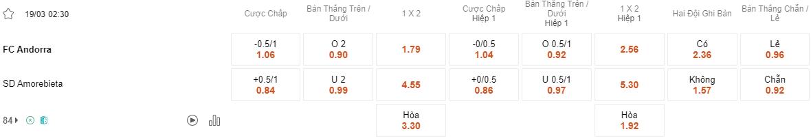 Với vị trí thứ 21 trên bảng xếp hạng, Andorra đang trong tình thế khá khó khăn nhưng vẫn giữ được sự ổn định hơn so với Amorebieta. Đội hình được sắp xếp tốt và khả năng tấn công của FC Andorra có thể tạo ra sức ép lớn đối với hàng phòng ngự của Amorebieta. Tỷ lệ thắng kèo ở cửa cược của họ chỉ vỏn vẹn 30% trong 10 trận gần nhất.