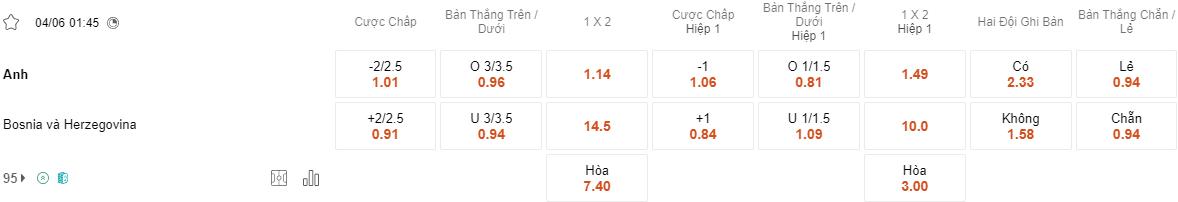 Trận đấu giữa Anh và Bosnia sắp tới dự đoán sẽ có nhiều bàn thắng được ghi. Cả hai đội đều có lối chơi tấn công mạnh mẽ, đặc biệt là đội tuyển Anh với hàng công chất lượng. Họ đã ghi được 14 bàn trong 5 trận gần nhất tại Euro, trung bình gần 3 bàn mỗi trận. Trong khi Bosnia đã để thủng lưới 13 bàn trong 5 trận gần nhất, trung bình gần 3 bàn mỗi trận. 4 trận gần nhất của Bosnia có tổng số bàn thắng vượt quá 2.5. Do đó, Tài đang là phương án lựa chọn sáng giá lúc này. Quý vị hãy cùng dõi theo kết quả tỷ số cập nhật tại BONGDAINFO.