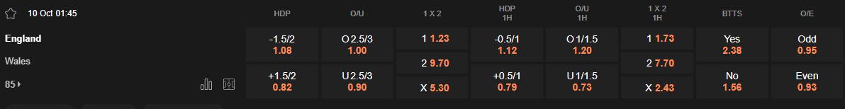 Tỷ lệ kèo Anh vs Wales