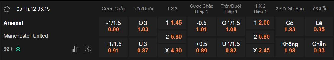 Tỷ lệ kèo Arsenal vs MU