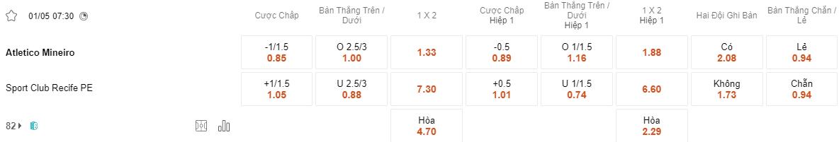 Tỷ lệ kèo Atletico Mineiro vs Sport Racife
