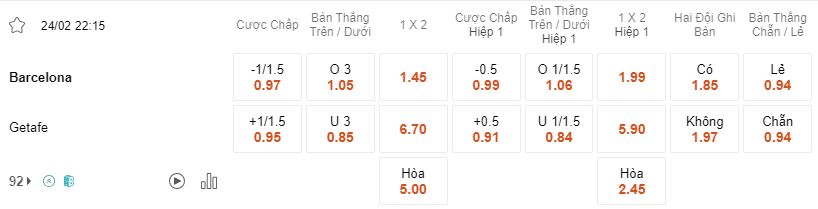 Soi kèo Barcelona vs Getafe lúc 22h15 ngày 24/2/2024