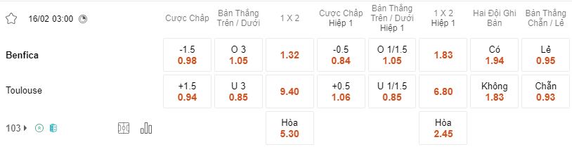 Soi kèo hiệp 1 Benfica vs Toulouse