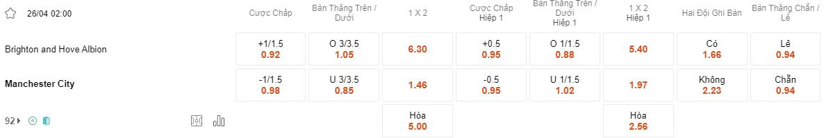 Sau 32 trận đã đấu, hàng thủ của Brighton đã phải nhận tới 50 bàn thua. Trong khi đó, Man City đã có được 76 bàn thắng và chỉ để thủng lưới 32 bàn sau 32 trận. Dựa vào phong độ của hai đội, việc chọn Man City thắng kèo có thể là một lựa chọn hợp lý cho trận đấu này. The Citizens cũng đã giành chiến thắng trong 4/5 chạm trán với Chim mòng biển gần nhất.