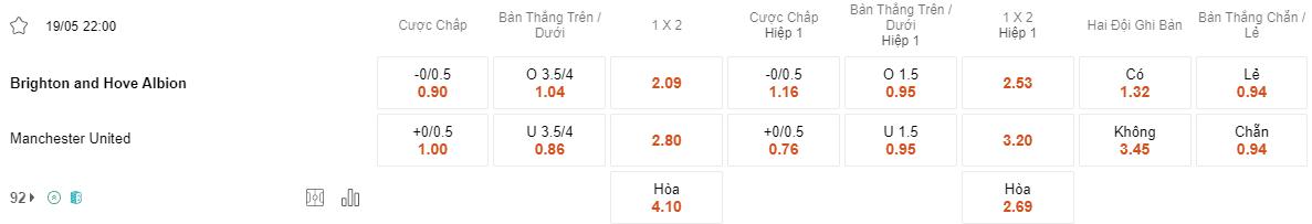 Tỷ lệ kèo Brighton vs MU