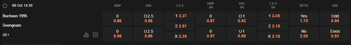 Một điểm mạnh đáng chú ý của Seongnam chính là khả năng nhập cuộc rất tốt. Họ thường triển khai pressing tầm cao và tìm cách sớm chiếm ưu thế về thế trận. Thống kê cho thấy, trong 5 trận hành quân gần nhất, Seongnam có tới 4 trận ghi bàn ngay trong hiệp 1. Hàng công năng nổ cùng khả năng phối hợp trung lộ hiệu quả giúp đội khách thường xuyên tạo ra sự khác biệt sớm. Ngược lại, Bucheon lại có thói quen nhập cuộc chậm và thường gặp khó khăn trong việc kiểm soát bóng trước các đối thủ chơi áp sát. Ở 3/4 trận gần nhất, họ để đối phương dẫn bàn trong hiệp 1. Trước một Seongnam đang đạt phong độ cao, khả năng Bucheon thủng lưới sớm là điều rất dễ xảy ra. Với sức tấn công ổn định cùng tinh thần tự tin, Seongnam thắng hiệp 1 là lựa chọn sáng giá cho giới đầu tư.