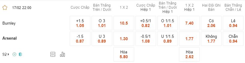 Soi kèo Burnley vs Arsenal lúc 22h00 ngày 17/2/2024