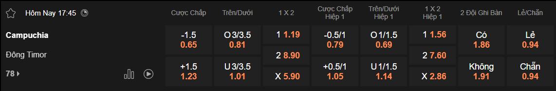 Theo tỷ lệ kèo nhà cái châu Á hôm nay, Campuchia đang ở cửa trên và nhận mức chấp là 1 1/2. Campuchia vừa được đánh giá cao hơn lại vừa phải chơi tất tay trong trận đấu này để hy vọng vào tấm vé đi tiếp. 2 bàn vào lưới Malaysia hay thua cách biệt 1 bàn trước Singapore rõ ràng là cơ sở để tin rằng tuyển quốc gia này có thể thắng áp đảo Timor Leste.
