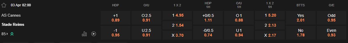 Reims có thể gặp khó khăn trong việc kiểm soát thế trận nhưng với đẳng cấp của mình, họ vẫn có thể tạo ra sự khác biệt từ sớm. Trong trận thắng Marseille vừa qua, họ đã có bàn dẫn trước trong hiệp 1, cho thấy sự khởi đầu tốt hơn so với giai đoạn trước đó. Cannes nhiều khả năng sẽ nhập cuộc thận trọng và cố gắng cầm cự, nhưng áp lực từ Reims có thể khiến họ mắc sai lầm. Với sự chênh lệch về trình độ, đội khách có thể dẫn trước ngay trong 45 phút đầu tiên.