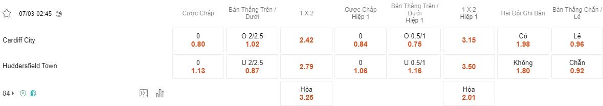 Tỷ lệ kèo Cardiff vs Huddersfield