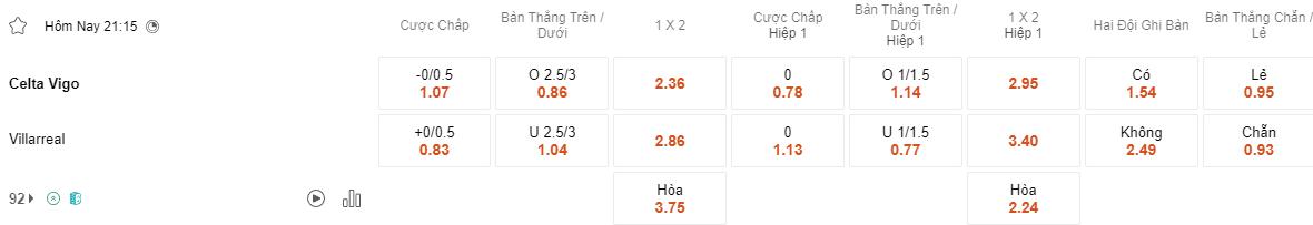 Tỷ lệ kèo Celta Vigo vs Villarreal
