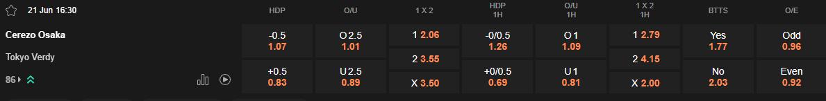 Cerezo Osaka có xu hướng nhập cuộc nhanh và sớm tìm được bàn thắng. Trong 5 trận sân nhà gần đây, họ đều dẫn bàn trước giờ nghỉ ở 3 trận. Sự ăn ý trong cách phối hợp tấn công cùng lợi thế sân nhà giúp Cerezo thường xuyên chiếm thế thượng phong ngay từ hiệp đầu. Tokyo Verdy lại có xu hướng nhập cuộc khá chậm và dễ để mất thế trận. 3/4 trận gần nhất, họ để thủng lưới trong 45 phút đầu tiên. Với khả năng kiểm soát trận đấu và phong độ sân nhà vượt trội, Cerezo Osaka hoàn toàn có thể dẫn trước sau hiệp 1.