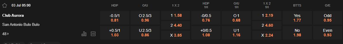Club Aurora thường nhập cuộc chủ động khi được thi đấu trên sân nhà. Trong 2 trận gần nhất tại Copa Pacena, họ đều có bàn thắng ngay trong hiệp 1. Trái lại, San Antonio thường xuyên để thủng lưới sớm, nhất là khi thi đấu xa nhà. Với sự khác biệt lớn về phong độ và tâm lý thi đấu, Club Aurora có khả năng cao sẽ sớm vươn lên dẫn trước sau 45 phút đầu tiên.