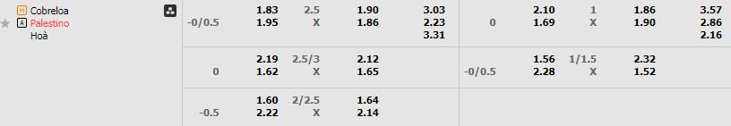 Cũng theo thống kê cho thấy, có 3/5 lần ra quân gần nhất, Palestino đã ghi được bàn ngay hiệp 1 trận đấu. Trong khi. Cobreloa lại đang chơi phòng ngự thiếu chắc chắn trên sân nhà. Với việc họ đã nhận bàn thua trong hiệp 1 ở 4/5 lần ra quân gần nhất. Do đó, khả năng cao Palestino sẽ ghi bàn dẫn trước và thắng kèo hiệp 1 trận này.