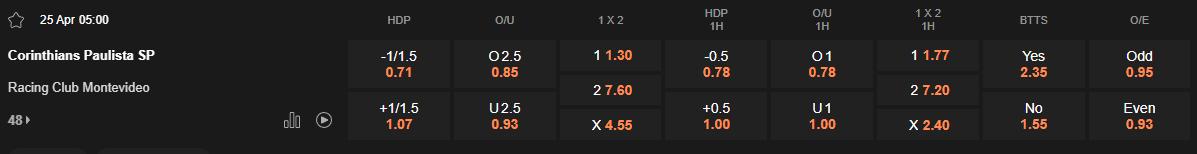 Thống kê cho thấy, Corinthians đã thắng kèo châu Á trong 5/8 trận sân nhà gần nhất tại các giải đấu. Trong đó có nhiều chiến thắng cách biệt trước những đối thủ ngang hoặc dưới tầm. Đội bóng này thường chủ động dâng cao ép sân, đặc biệt trong hiệp 1. Qua đó họ tạo áp lực lớn bằng những pha đánh trung lộ và ban bật nhanh – điều mà Racing sẽ rất khó chống đỡ khi phải đá xa nhà.