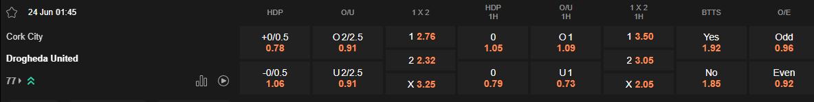 Tỷ lệ kèo Cork City vs Drogheda