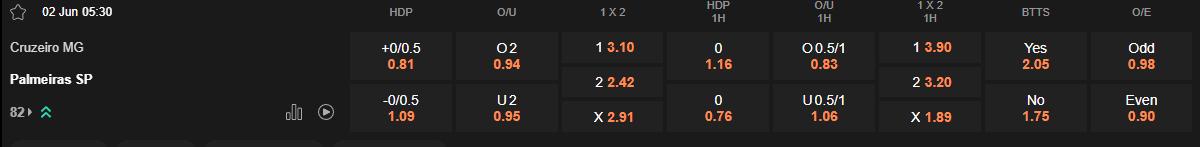 Tỷ lệ kèo Cruzeiro vs Palmeiras