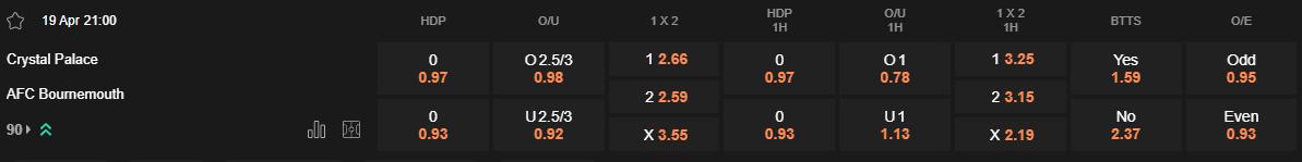 Tỷ lệ kèo Crystal Palace vs Bournemouth