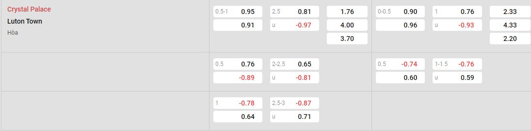 Đội chủ nhà Crystal Palace đang là cửa đặt an toàn trên sân nhà. Khi mà họ đã giành 3 chiến thắng sau 5 trận kèo gần nhất. Trong khi đó, Luton lại đang không có được thành tích kèo ấn tượng. Với việc họ đã trắng tay trong 5 trận kèo gần nhất. Do đó, với việc chấp 0.75 bàn trước đối thủ, các chuyên gia đang đánh giá Crystal Palace sẽ là lựa chọn an toàn hơn.