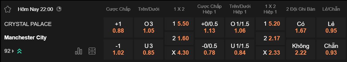 Theo tỷ lệ kèo nhà cái châu Á hôm nay, Man City đang ở cửa trên và nhận mức chấp là 1. Ngay cả khi chỉ thắng với cách biệt 1 bàn, đội khách vẫn không khiến những người tin tưởng mình mất vốn. Đây rõ ràng là phương án đầu tư hợp lý khi nửa xanh thành Manchester đã biết thắng trở lại. Họ cũng giành 3 thắng lợi ở 4 lần gần nhất chạm trán Crystal Palace.