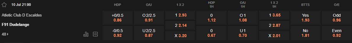 Dudelange thường có xu hướng áp đặt thế trận ngay từ đầu trước các đối thủ yếu hơn, đặc biệt là ở các vòng loại cúp châu Âu. Trong 3/4 trận sân khách gần nhất, họ đều ghi bàn trong hiệp 1 và dẫn trước đối thủ trước khi bước vào giờ nghỉ. Ngược lại, Escaldes lại có thói quen nhập cuộc chậm chạp. Họ từng bị dẫn trước ở cả 2 lần gần nhất chạm trán Dudelange. Việc để đối phương kiểm soát khu trung tuyến và thiếu sức phản kháng khiến Escaldes thường đánh mất thế trận rất sớm. Với sự vượt trội về lực lượng, kinh nghiệm và tâm lý thi đấu, Dudelange thắng hiệp 1 là phương án sáng giá.