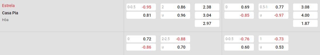 Estrela đang có phong độ thi đấu khá thất vọng trong thời gian gần đây. Theo thống kê cho thấy, sau 5 trận ra quân gần nhất, họ chỉ giành được 1 chiến thắng. Được chơi trên sân nhà, tuy nhiên, phải tiếp đón các vị khách Casa Pia, đây thực sự là một thử thách khó khăn. Do đó, các chuyên gia đang đánh giá cao Casa Pia hơn trong trận kèo này.