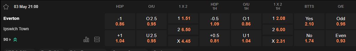 Một trong những điểm sáng hiếm hoi của Everton mùa này là khả năng nhập cuộc tốt khi thi đấu trên sân nhà. Trước một Ipswich đã xuống hạng và không còn động lực thi đấu, Everton hoàn toàn có thể tạo áp lực sớm và tìm được bàn thắng ngay trong hiệp 1. Ngược lại, Ipswich đã để thủng lưới trong 45 phút đầu ở 2 trận gần nhất – một con số cho thấy họ rất dễ mất kiểm soát thế trận từ đầu. Khả năng Everton dẫn trước sau hiệp 1 là rất cao.