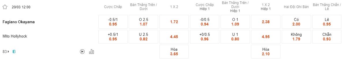 Dựa vào phong độ ấn tượng và lợi thế sân nhà, cùng với sự ổn định trong hàng phòng ngự và khả năng tấn công của mình, Fagiano Okayama được dự đoán sẽ giành chiến thắng kèo trong trận đấu này. Mặt khác, Mito Hollyhock đang là điểm cược kém hấp dẫn. Cửa cược của họ đã khiến bet thủ ôm hận trong 4 lần mở kèo gần đây.