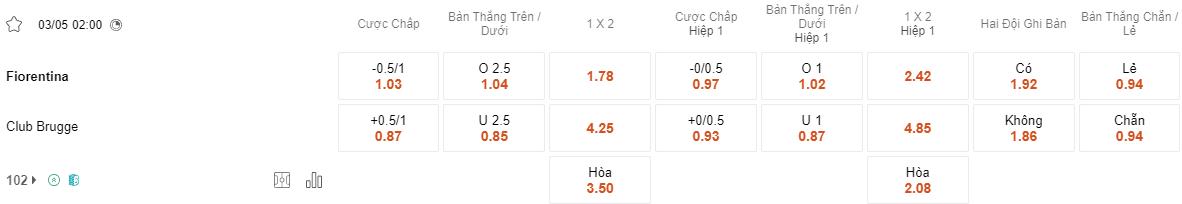 Tỷ lệ kèo Fiorentina vs Club Brugge