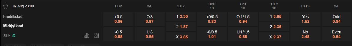 Ở chiều ngược lại, Midtjylland không còn giữ được phong độ ổn định như những mùa giải trước. Dù có bề dày kinh nghiệm tại sân chơi châu Âu, nhưng họ lại thua kèo 4/5 trận gần đây. Điều này phần nào phản ánh sự sa sút về mặt tinh thần và hiệu quả thi đấu của họ. Đặc biệt, việc từng để thua Fredrikstad với tỷ số 0-1 ở lần gặp nhau gần nhất sẽ là yếu tố tâm lý khiến Midtjylland chịu áp lực trong trận lượt đi này.
