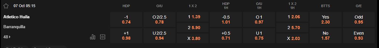 Huila là đội có thói quen nhập cuộc mạnh mẽ mỗi khi chơi trên sân nhà. Trong 4 trận gần nhất tại Estadio Guillermo Plazas Alcid, họ có 2 lần vươn lên dẫn trước ngay hiệp đầu. Sức tấn công của Huila chủ yếu đến từ các tình huống phối hợp biên tốc độ. Ngược lại, Barranquilla thường xuyên khởi đầu chậm chạp. Họ đã bị thủng lưới trong hiệp 1 ở 5/7 trận gần đây, và có tới 4 lần bước vào giờ nghỉ trong thế bị dẫn bàn. Lối chơi thiếu tổ chức, khả năng tranh chấp yếu ở tuyến giữa khiến Barranquilla gần như luôn bị cuốn vào thế trận của đối thủ. Trước một đối thủ có phong độ yếu kém, Huila hoàn toàn có thể định đoạt trận đấu ngay trong 45 phút đầu tiên. Việc họ ghi bàn dẫn trước trong hiệp 1 là kịch bản rất khả thi.