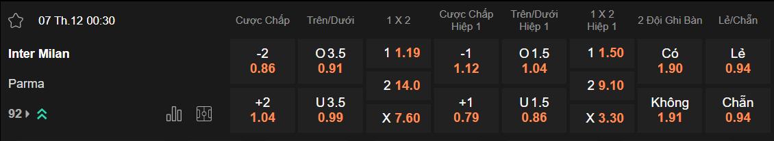 Theo tỷ lệ kèo nhà cái châu Á hôm nay, Inter đang ở cửa trên và nhận mức chấp là 2. Như vậy, chủ nhà cần giành chiến thắng với cách biệt ít nhất 2 bàn để những người tin tưởng mình không mất vốn. Kịch bản họ có thể thắng cách biệt từ 3 bàn để thắng kèo rất khó xảy ra. Trong cả 6 trận sân nhà gần nhất, Inter giành 4 thắng lợi nhưng cách biệt đều chỉ là 1 bàn. Parma ít giành chiến thắng nhưng cũng không phải nhận quá nhiều thất bại. Kể từ đầu mùa, họ mới chỉ có đúng 1 lần thua với cách biệt nhiều hơn 1 bàn.