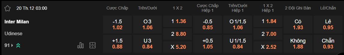 Inter đang chấp 1/2 trong kèo hiệp 1. Khả năng họ có bàn mở tỷ số và duy trì được thế dẫn bàn rõ ràng rất cao. Tính trong 4/5 trận gần nhất, chủ nhà luôn kết thúc 45 phút đầu với cách biệt về mặt tỷ số so với các đối thủ. Ở trận gặp Lazio vừa qua, họ cũng ghi được tới 2 bàn ngay trong hiệp 1. Trước một Udinese yếu kém, tập thể này hứa hẹn sẽ nhanh chóng đẩy cao đội hình và gây được nhiều sóng gió.