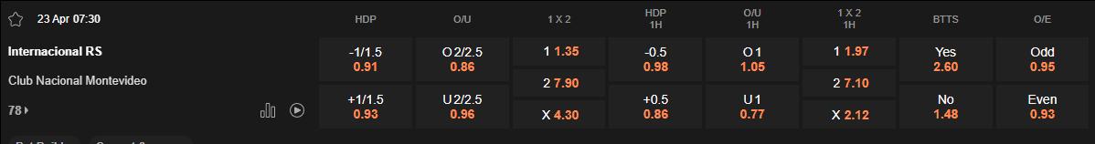 Trong khi đó, phong độ của Nacional tại Libertadores không thật sự ấn tượng. Thống kê chỉ ra rằng Nacional đã thua 2 trận gần nhất tại giải đấu này. Trong đó họ chịu thủng lưới ở cả 2 lượt trận mà chưa có được bất kỳ bàn thắng nào. Với tỷ lệ chấp không quá sâu (-1.0 đến -1.25), Internacional hoàn toàn có thể vượt kèo châu Á. Nhất là khi họ kiểm soát tốt thế trận và biết cách tận dụng thời cơ trước đối thủ chơi thiên về phòng ngự.
