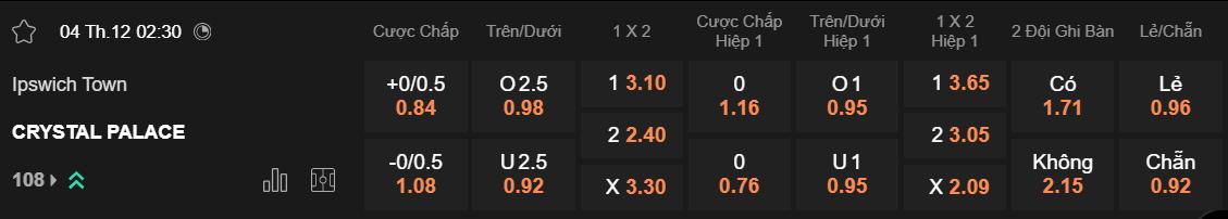 Theo tỷ lệ kèo nhà cái châu Á hôm nay, Crystal Palace đang ở cửa trên và nhận mức chấp là 1/4. Như vậy, họ cần phải giành chiến thắng để giúp những người tin tưởng mình có lợi nhuận. Kịch bản này khó xảy ra với tình hình hiện tại. Ipswich có đủ sự lì lợm để khiến đối thủ phải trải qua thêm một trận đấu bế tắc nữa. Khả năng chủ nhà có điểm được đánh giá rất cao.