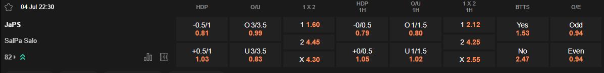 SalPa có xu hướng nhập cuộc tốt trong các trận sân khách, thường tận dụng cơ hội để ghi bàn sớm rồi chơi chặt chẽ bảo toàn tỷ số. Trước một JaPS nhập cuộc thiếu tập trung và hay mắc sai lầm ở hàng thủ, khả năng đội khách dẫn trước sau hiệp 1 là rất cao. Ở lần đối đầu gần nhất tại sân JaPS, SalPa cũng đã có bàn thắng ngay trong hiệp một và duy trì lợi thế đến cuối trận. Phong độ đầu trận của JaPS mùa này là khá tệ, với nhiều bàn thua trong 30 phút đầu tiên – đây là điểm yếu mà SalPa có thể khai thác.